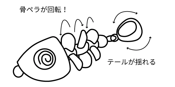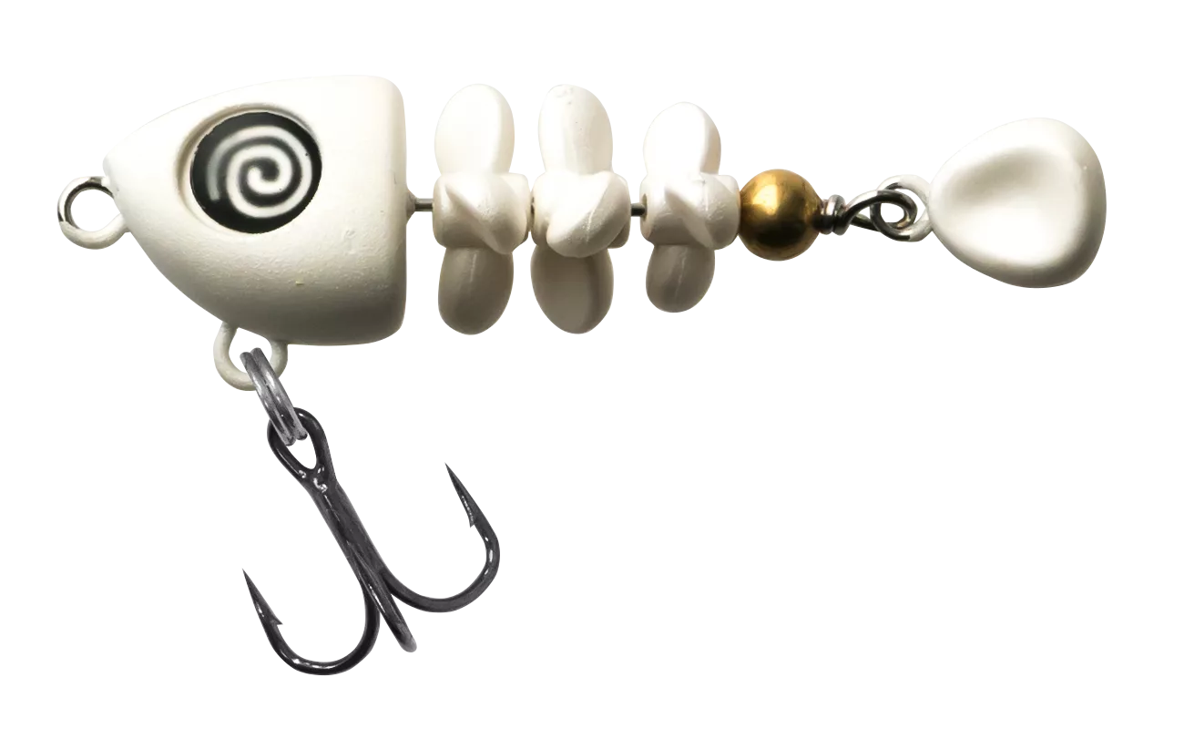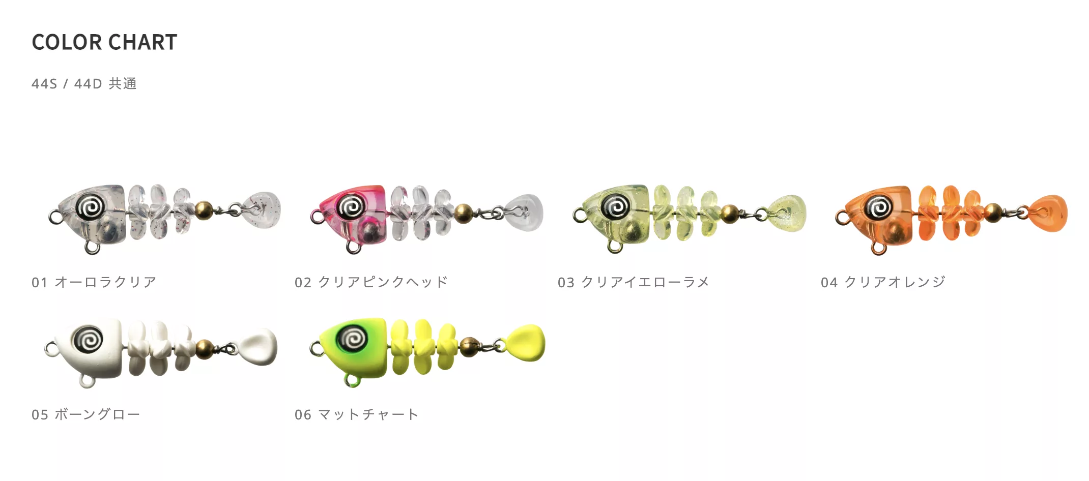 規格 魚骨 44 Shallow(淺水型) 2.0g/44mm 魚骨 44 Deep(深水型) 2.5g/44mm 小魚骸骨造型的擬餌 **“魚骨(ぎょっこつ)”** 登場! 在慢速收線時,骨片會**扭扭〜轉轉〜**,以螺旋與扭動產生微妙的飄浮感與波動;在下沉時,更呈現**搖搖晃晃〜轉轉轉〜彷彿靈魂出竅般的無力下沉動作**,讓石斑魚等底棲類以及各種掠食性魚類深深著迷!