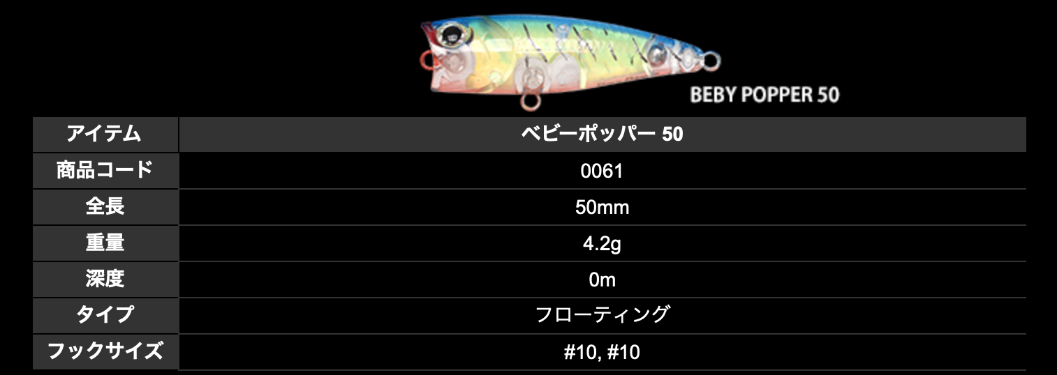 ベビーポッパー 50 重量:4.2g 深度:0m タイプ:フローティング フックサイズ:#10, #10